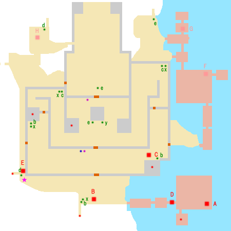 勝利条件:孫権の撃破 敗北条件:曹丕の敗走 制限時間:90分 ■点心 ・太史慈 撃破(D) ■仙酒 ・左下の拠点のツボ(★) ■武器 ・赤紫点 ■アイテム ・青紫点 ・程普 ■回復アイテム a:体力+50 b:体力+100 c:体力+200 d:体力+400 e:体力MAX x:弓+10 y:覚醒印 ■敵武将 A:孫権(諸葛瑾、諸葛格) B:陸遜(朱治、韓当、周魴) C:太史慈(全j、朱桓) D:周泰 E:程普(丁奉、徐盛、馬忠) F:蒋欽(陣武) G:潘璋(董襲) H:孫韶(張承) ■攻略アドバイス 右上の船は、敵援軍出現時に現れる。 城内にいる敵を倒しながら進もう。 |