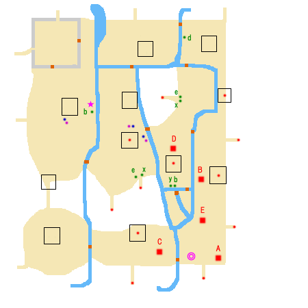 勝利条件:孫権の撃破 敗北条件:張遼の敗走 制限時間:60分 ■点心 ・孫韶 撃破(◎) ■仙酒 ・北西の魏軍補給拠点の右(★) ■武器 ・赤紫点 ■アイテム ・青紫点 ■回復アイテム a:体力+50 b:体力+100 c:体力+200 d:体力+400 e:体力MAX x:弓+10 y:覚醒印 ■敵武将 A:孫権(諸葛瑾、蒋欽、孫韶) B:太史慈(陣武、朱然) C:呂蒙(徐盛、張承) D:潘璋(馬忠、丁奉) E:朱治(周魴、朱桓) F: ■攻略アドバイス 朱治を倒しに行きつつ、途中の敵将を倒して行こう。 張遼が孫権の元に行って、 他の敵将が集まってくるので、 素早く救出に向かおう。 |