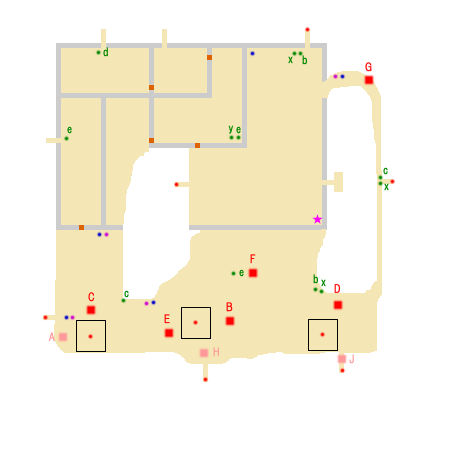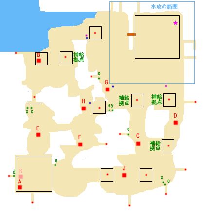 勝利条件:曹操の脱出地点への到達 敗北条件:曹操の敗走 制限時間:60分 ■点心 ・孫権 撃破(A) ■仙酒 ・潘璋いるところの右上(細い道手前)(★) ■武器 ・赤紫点 ・劉備 ■アイテム ・青紫点 ■回復アイテム a:体力+50 b:体力+100 c:体力+200 d:体力+400 e:体力MAX x:弓+10 y:覚醒印 ■敵武将 A:孫権 B:潘璋(徐盛、丁奉) C:程普(董襲) D:韓当 E:朱治(陳武) F:趙雲(麋竺) G:張飛(簡雍) H:関平(周倉) J:関羽 K:劉備(孫乾、麋芳) ■攻略アドバイス 曹操に付いて行こう。 味方援軍も多いので、 後ろの敵は援軍に任せて、 曹操周辺から前方の敵を集中して倒そう。 味方援軍は、敵護衛部隊を倒すと出現する。 (例:程普が出現したら董襲倒す) 関羽は曹操が近づけば撤退するので、 倒しに行く必要はない。 |