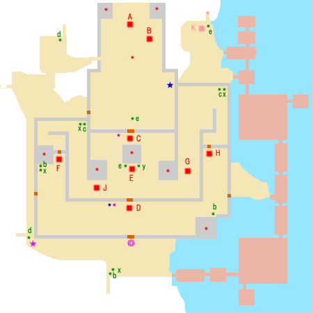 勝利条件:曹丕の撃破 敗北条件:孫権の敗走 制限時間:90分 ■点心 ・孫礼 撃破(◎) ■仙酒 ・左下の拠点のツボ(★) ■武器 ・赤紫点 ・曹彰 ・王郎 ■アイテム ★(真空書):5分以内に曹仁撃破 ・青紫点 ・曹洪 ■回復アイテム a:体力+50 b:体力+100 c:体力+200 d:体力+400 e:体力MAX x:弓+10 y:覚醒印 ■敵武将 A:曹丕(甄姫、辛?、賈逵) B:司馬懿(司馬昭) C:許チョ D:徐晃(孫礼、夏侯覇、夏侯威) E:曹仁 F:曹彰(曹休) G:曹洪(夏侯尚) H:王郎(文聘) J:曹真(夏侯恵) K:曹叡(満寵) ■攻略アドバイス 左側から城内に入り、曹彰を撃破して、 曹仁の所へ行く。 (途中、味方援軍出現) 5分以内に曹仁を倒すと、貴重品報告となる。 その後、すぐに曹丕の元に向かっても良い。 レベル上げをするなら、 後々右上から曹叡が現れるので注意。 (本陣がやられる可能性が出てくる) |