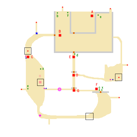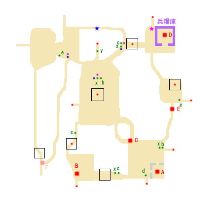 勝利条件:袁紹の撃破 敗北条件:華雄の敗走 または水関の陥落 制限時間:60分 ■点心 ・袁術 撃破(D) ■仙酒 ・右上の進入拠点のツボ(★) ■武器 ・赤紫点 ■アイテム ・青紫点 ★(鉄甲手):曹操出現(約6分)前に孫堅撃破 ■回復アイテム a:体力+50 b:体力+100 c:体力+200 d:体力+400 e:体力MAX x:弓+10 y:覚醒印 ■能力アップ(参考までに) 紀霊:攻撃+2 関羽:攻撃+2 劉備:攻撃+2 韓当:防御+2 朱治:防御+2 黄蓋:攻撃+2 孫堅:攻撃+2 夏侯惇:攻撃+2 曹操:攻撃+2 公孫サン:防御+2 沮授:防御+2 ■敵武将 A:袁紹(沮授) B:孫堅(黄蓋、朱治、韓当) C:劉備(関羽) D:袁術(紀霊) E:公孫サン F:曹操(夏侯惇) ■攻略アドバイス 右上にいる袁術を倒し、 兵糧庫を封鎖する。 鉄甲手を取ってない人は、 次に孫堅を倒しに行く。 取っている人は、そのまま袁紹を倒しに行こう。 |