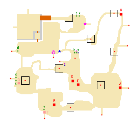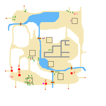 勝利条件:曹操の撃破 敗北条件:呂布の敗走 制限時間:90分 ■点心 ・夏侯淵 撃破(C) ■仙酒 ・中下の進入拠点(★) ■武器 ・赤紫点 ・張飛 ■アイテム ・青紫点 ■回復アイテム a:体力+50 b:体力+100 c:体力+200 d:体力+400 e:体力MAX x:弓+10 y:覚醒印 ■敵武将 A:曹操(朱霊、郭嘉) B:夏侯惇(于禁) C:夏侯淵(李典) D:劉備 E:関羽 F:張飛 G:曹洪(楽進、満寵) ■攻略アドバイス 開始直後、いきなり水没する。 張飛を倒して、あとは援軍到着地点を守りつつ、 攻めて行こう。 |