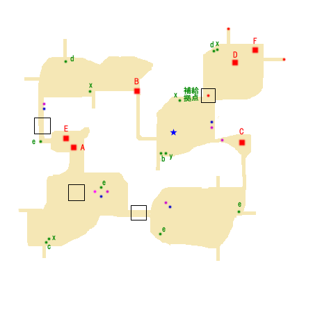 勝利条件:孫権の撃破 敗北条件:孟獲の敗走 制限時間:60分 ■点心 ・朱然 撃破(E) ■仙酒 ・マップ中央の敵拠点付近のツボ(★) ■武器 ・赤紫点 ■アイテム ・青紫点 ■回復アイテム a:体力+50 b:体力+100 c:体力+200 d:体力+400 e:体力MAX x:弓+10 y:覚醒印 ■敵武将 A:孫権(諸葛瑾) B:孫尚香(潘璋、丁奉) C:呂蒙(陸遜) D:周泰(徐盛) E:朱然(朱桓) F: G: ■攻略アドバイス 中央の周泰・朱然を倒したあと、 橋付近にいる陸遜を倒し、 左側から敵本陣に向かおう。 |