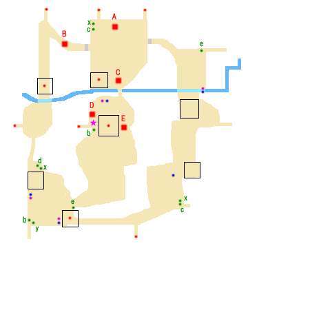勝利条件:張角の撃破 敗北条件:孟獲の敗走 または威厳の失墜 制限時間:45分 ■点心 ・波才 撃破(D) ■仙酒 ・孟獲初期位置付近のツボ(★) ■武器 ・赤紫点 ■アイテム ・青紫点 ★(象鐙):5分以内に張角・管亥以外の敵将を全て倒す ■回復アイテム a:体力+50 b:体力+100 c:体力+200 d:体力+400 e:体力MAX x:弓+10 y:覚醒印 ■能力アップ(参考までに) 張角:攻撃+4 裴元紹:攻撃+4 張梁:防御+4 張宝:防御+4 程遠志:攻撃+4 張曼成:防御+4 ■敵武将 A:張角 B:張宝(程遠志) C:張梁(何儀) D:波才(張曼成) E:裴元紹 F:管亥 ■攻略アドバイス 初期位置の張角は、 撃破すると右上に移動する。 左から回って味方の救出に向かうと良い。 |