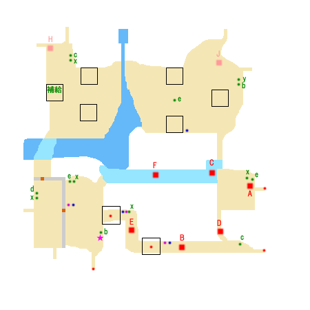 勝利条件:曹操の撃破 敗北条件:馬超の敗走 または曹操軍の潼関北門東門のいずれかの突破 制限時間:60分 ■点心 ・許チョ 撃破(C) ■仙酒 ・左下右側の拠点のツボ(★) ■武器 ・赤紫点 ■アイテム ・青紫点 ■回復アイテム a:体力+50 b:体力+100 c:体力+200 d:体力+400 e:体力MAX x:弓+10 y:覚醒印 ■敵武将 A:曹操(賈ク) B:夏侯淵 C:許チョ D:張コウ E:曹洪 F:朱霊 G:徐晃 H:曹仁 ■攻略アドバイス まずは曹洪(E)・朱霊(F)を撃破しよう。 川を渡って許チョ・張コウを倒したら、 城に戻る。 ここで夏侯淵も撃破してから、 曹操の北門からの侵入を防ぐ。 韓遂が離反すると、 次々に味方軍が撤退するので注意。 |