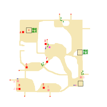 勝利条件:馬謖の撃破(諸葛亮の撃破) 敗北条件:曹丕または司馬懿敗走 制限時間:60分 ■点心 ・王平 撃破(C) ■仙酒 ・中央広場左上のツボ(★) ■武器 ・赤紫点 ■アイテム ・青紫点 ■回復アイテム a:体力+50 b:体力+100 c:体力+200 d:体力+400 e:体力MAX x:弓+10 y:覚醒印 ■敵武将 A:馬謖(李厳、簡雍、陣式) B:姜維(張翼) C:王平(関興) D:高翔(廖化) E:馬岱 F:張苞 G:魏延 H:星彩 J:諸葛亮 K:馬超 ■攻略アドバイス 中央の廖化・高翔を倒し、 進入拠点を占拠しよう。 次に、関興・王平を倒し、 左中の進入拠点も占拠しよう。 逆落としを阻止すると、 勝利条件が諸葛亮撃破になる。 (諸葛亮は後ほど援軍として登場) |