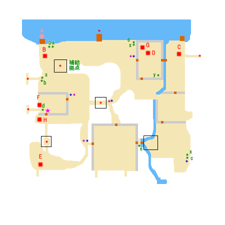 勝利条件:孫策の撃破 敗北条件:劉ヨウの敗走 制限時間:60分 ■点心 ・孫権 撃破(B) ■仙酒 ・左中の城内左下のツボ(★) ■武器 ・赤紫点 ■アイテム ・青紫点 ■回復アイテム a:体力+50 b:体力+100 c:体力+200 d:体力+400 e:体力MAX x:弓+10 y:覚醒印 ■敵武将 A:孫策(孫尚香) B:周瑜 C:孫権 D:周泰 E:程普 F:韓当 G:董襲 H:蒋欽 J:兀突骨 ■攻略アドバイス 左から、程普(E)→董襲(G)→韓当(F)と倒して行こう。 その後、周泰・孫権を倒そう。 |