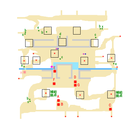 勝利条件:諸葛亮の撃破(姜維の撃破) 敗北条件:曹丕の敗走または自軍本陣の陥落 制限時間:90分 ■点心 ・魏延 撃破(D) ■仙酒 ・マップ中央の砦左側(川の北)(★) ■武器 ・赤紫点 ・月英 ■アイテム ・青紫点 ■回復アイテム a:体力+50 b:体力+100 c:体力+200 d:体力+400 e:体力MAX x:弓+10 y:覚醒印 ■敵武将 A:諸葛亮 B:姜維(蒋エン、楊儀) C:月英(高翔、陣式) D:魏延(李厳、関興、張苞) E:王平 F:廖化(費イ) G:馬岱 H:関索 ■攻略アドバイス 少し経つと、左中から鍾会が出現するので、 援護して城まで到達させよう。 川の右の方に、 守備兵長が出現するので、 倒しておくと少し楽になる。 右下の虎車は、攻撃すれば壊せる。 ある程度時間が経過すると、 諸葛亮が死亡し、姜維が大将となる。 |