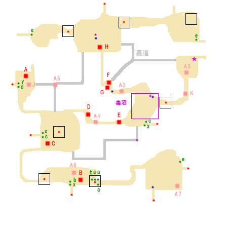 勝利条件:孟獲の撃破 敗北条件:諸葛亮の敗走 制限時間:60分 ■点心 ・兀突骨 撃破(C) ■仙酒 ・右上の敵拠点(★) ■武器 ・赤紫点 ■アイテム ・青紫点 ■回復アイテム a:体力+50 b:体力+100 c:体力+200 d:体力+400 e:体力MAX x:弓+10 y:覚醒印 ■能力アップ(参考までに) 木鹿大王:攻撃+2 孟獲1:攻撃+2 孟獲2:攻撃+2 孟獲3:攻撃+2 孟獲4:攻撃+2 孟獲5:攻撃+2 孟獲6:攻撃+2 阿会喃:攻撃+2 董荼那:攻撃+1 金環三結:防御+2 孟優:防御+2 祝融:防御+2 ■敵武将 A:孟獲(孟優) B:祝融 C:兀突骨(忙牙長) D:金環三結 E:朶思大王 F:阿会喃 G:董荼那 H:木鹿大王 J:帯来洞主 K:楊鋒 ■攻略アドバイス 虎や毒沼は、 右側にある敵拠点を占有すれば、 解消できる。 裏道に入ると、敵の士気が下がる。 象に乗った敵将は、弓矢で落とそう。 兀突骨付近は、爆弾が仕掛けられるので、 上手く利用すると楽になる。 孟獲は倒す毎に移動する。 (A?地点の順番) 早く終わらせたければ、マップ右下に行けばOK。 |