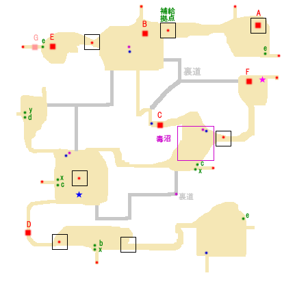 勝利条件:諸葛亮の撃破 敗北条件:孟獲の敗走 制限時間:60分 ■点心 ・魏延 撃破(E) ■仙酒 ・右端、上から2番目の拠点(関索右)のツボ(★) ■武器 ・赤紫点 ■アイテム ・青紫点 ★(無双鎧):虎戦車を全て破壊 ■回復アイテム a:体力+50 b:体力+100 c:体力+200 d:体力+400 e:体力MAX x:弓+10 y:覚醒印 ■敵武将 A:諸葛亮(馬謖、張翼、王平) B:月英(廖化、張苞) C:黄忠(厳顔) D:魏延(馬岱、呂凱) E:関興 F:関索 G:馬超 ■攻略アドバイス まずは自軍本陣近くにいる、 魏延(馬岱・呂凱)を倒そう。 左中の拠点で諸葛亮の計略が心服したら、 すぐに救出に向かおう。 (工作兵員を4人倒せばOK) 近くの拠点占拠や王平・張翼を倒して イベント発生まで待とう。 その後、中央上の金環三結の救出へ。 裏道を上手く使って行けば、 時間短縮できる。 |