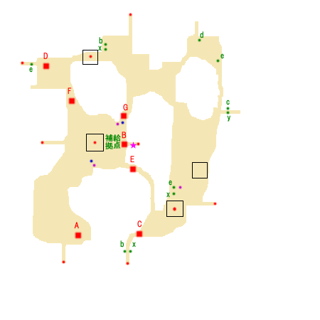 勝利条件:劉備の撃破 敗北条件:自軍本陣の陥落 制限時間:60分 ■点心 ・黄忠 撃破(◎) ■仙酒 ・北西の魏軍補給拠点の右(★) ■武器 ・赤紫点 ・趙雲 ■アイテム ・青紫点 ・李厳 ■回復アイテム a:体力+50 b:体力+100 c:体力+200 d:体力+400 e:体力MAX x:弓+10 y:覚醒印 ■敵武将 A:劉備(法正) B:黄忠(厳顔、雷銅) C:趙雲(劉封、張翼) D:魏延(孟達) E:関平 F:李厳 G:呉蘭(陣武) ■攻略アドバイス 右下から攻めていこう。 黄忠の回りには弓兵がたくさんいるので注意。 馬に乗ったまま、 弓兵を倒してから黄忠と戦ったほうがいい。 |
