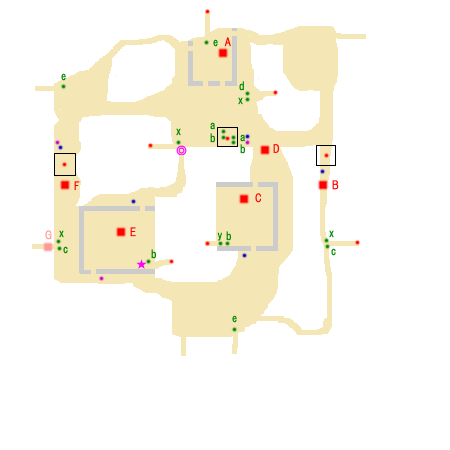 勝利条件:天水城、南安城、安定城の陥落 敗北条件:諸葛亮の敗走 制限時間:45分 ■点心 ・梁緒 撃破(◎) ■仙酒 ・安定城内の拠点付近のツボ(★) ■武器 ・赤紫点 ■アイテム ・青紫点 ■回復アイテム a:体力+50 b:体力+100 c:体力+200 d:体力+400 e:体力MAX x:弓+10 y:覚醒印 ■敵武将 A:馬遵(程武、尹賞、梁緒) B:姜維 C:夏侯楙 D:韓徳 E:崔諒 F:王郎 G:曹真 ■攻略アドバイス 南安城、安定城を陥落後、 姜維を倒すと、天水城の門が開き、 馬遵が逃げ出すので、馬遵を倒せば終了。 2つの城を陥落させる前に、 姜維が天水城に戻りだしたら、 姜維を優先して倒すこと。 |
