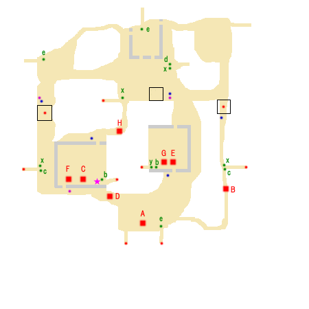 勝利条件:諸葛亮の撃破 敗北条件:馬遵の敗走 制限時間:60分 ■点心 ・趙雲 撃破(◎) ■仙酒 ・安定城内の拠点付近のツボ(★) ■武器 ・赤紫点 ■アイテム ・青紫点 ■回復アイテム a:体力+50 b:体力+100 c:体力+200 d:体力+400 e:体力MAX x:弓+10 y:覚醒印 ■能力アップ 馬岱:攻撃+2 関興:防御+2 月英:攻撃+2 王平:防御+2 張苞:攻撃+2 廖化:防御+2 魏延:攻撃+2 ■敵武将 A:諸葛亮 B:魏延(廖化) C:趙雲 D:月英(李厳) E:王平 F:関興 G:張苞 H:馬岱 ■攻略アドバイス まずは馬岱(H)を倒し、 安定城にいる、趙雲(C)・関興(F)を倒そう。 次に、月英(D)を倒して、 南安城の救援へ。 (魏延が本陣に近づいていたら、魏延を先に倒しに行く) |